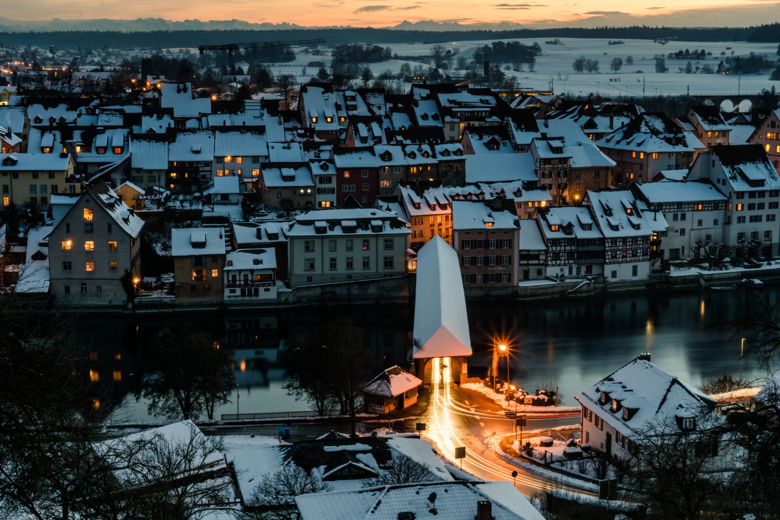 • Blick nach Diessenhofen bei Sonnenaufgang im Winter
